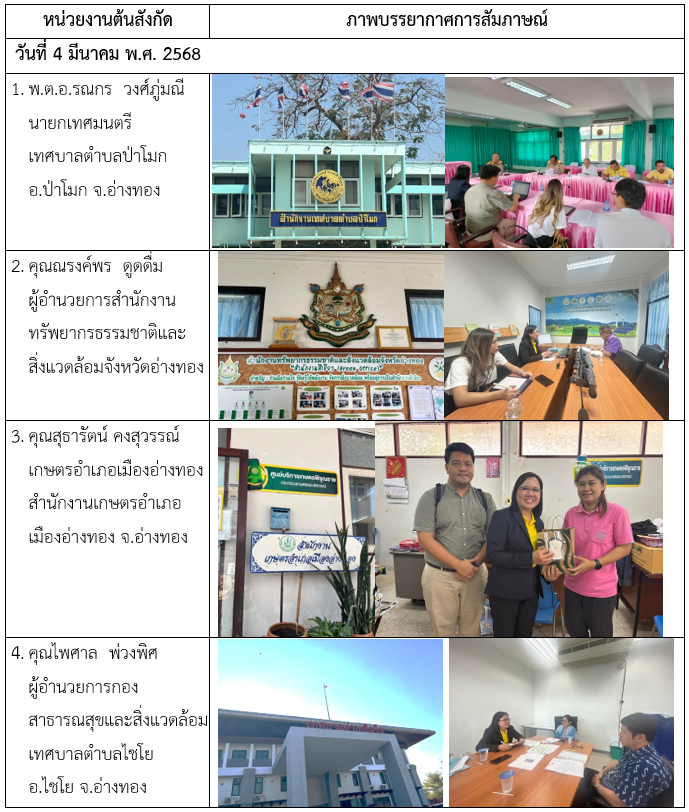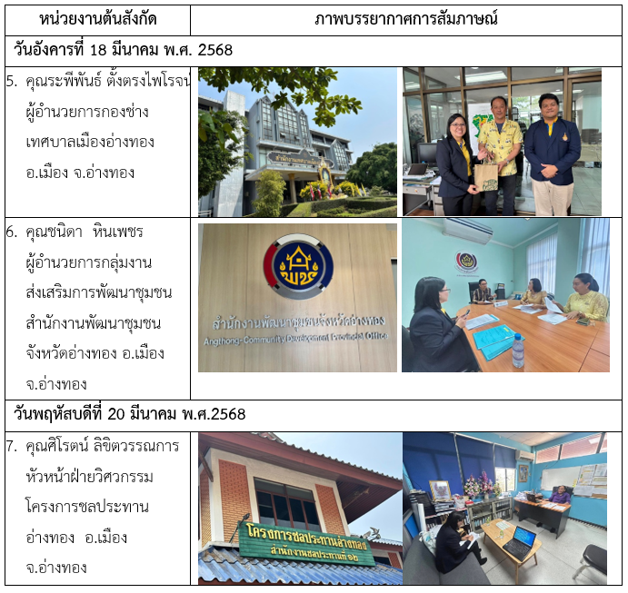 คณะผู้วิจัยได้เข้าพบและสัมภาษณ์ข้อมูลเชิงลึกผู้บริหารหรือผู้แทนจากหน่วยงานที่เกี่ยวข้องในจังหวัดอ่างทองเพื่อให้ได้ข้อมูลครบถ้วนถูกต้องและเพื่อนำผลจากการวิเคราะห์แบบสอบถามและผลจากการประชุมกลุ่มย่อย (small group discussion) นำมาสู่การวิพากษ์ (ร่าง) รูปแบบการพัฒนาและเพิ่มมูลค่าเศรษฐกิจหมุนเวียนอย่างมีส่วนร่วม ในส่วนการสัมภาษณ์ข้อมูลเชิงลึกนั้นมีคณะผู้วิจัยประกอบด้วย ผู้ช่วยศาสตราจารย์ ดร.หวานใจ หลำพรม หัวหน้าโครงการวิจัย และผู้ช่วยศาสตราจารย์ ดร.สุรศักดิ์ โจถาวร ผู้ร่วมวิจัยได้ลงพื้นที่เข้าพบเพื่อสัมภาษณ์ผู้บริหารและตัวแทนหน่วยงานภาครัฐที่เกี่ยวข้องจำนวน 7 หน่วยงาน ดังนี้