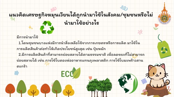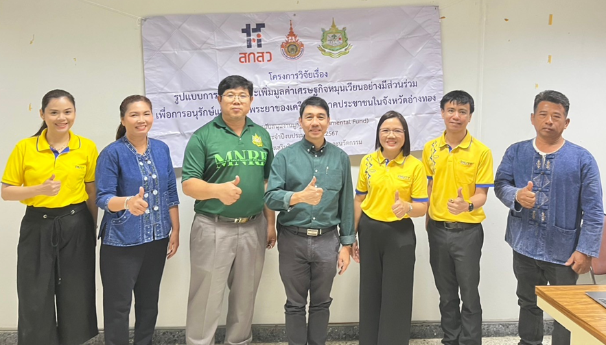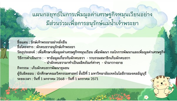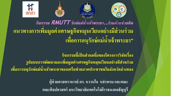 มหาวิทยาลัยเทคโนโลยีราชมงคลธัญบุรี มีความตระหนักในภารกิจที่ช่วยปลูกฝังและเสริมสร้างกระบวนการเรียนรู้การอนุรักษ์สิ่งแวดล้อม โดยในหลักสูตรที่มีการเรียนการสอนที่มุ่งเสริมสร้างกระบวนการเรียนรู้ผ่านรายวิชาต่างๆ ที่เปิดสอนในมหาวิทยาลัย โดยในรายวิชา 01-110-004 สังคมกับสิ่งแวดล้อม เป็นรายวิชาศึกษาทั่วไปที่เปิดสอนให้นักศึกษาในระดับปริญญาตรีในหลายหลักสูตร ในการนี้ ผศ.ดร.หวานใจ หลำพรม หัวหน้าโครงการวิจัย ได้บูรณาการผลการวิจัยเรื่อง รูปแบบการพัฒนาและเพิ่มมูลค่าเศรษฐกิจหมุนเวียนอย่างมีส่วนร่วมเพื่อการอนุรักษ์แม่น้ำเจ้าพระยาของเครือข่ายภาคประชาชนในจังหวัดอ่างทอง เป็นกิจกรรมการเรียนการสอน คือ กิจกรรม RMUTT รักษ์แม่น้ำเจ้าพระยา..ร่วมด้วยช่วยคิด แนวทางการเพิ่มมูลค่าเศรษฐกิจหมุนเวียนอย่างมีส่วนร่วมเพื่อการอนุรักษ์แม่น้ำเจ้าพระยา” โดยปีการศึกษา 2567 ตลอดทั้งสองภาคการศึกษาได้มีนักศึกษาที่ร่วมกิจกรรมนี้รวมจำนวน 236 คน และคณะผู้วิจัยจะขยายผลกิจกรรมไปยังปีการศึกษาต่อไป อนึ่ง ผลการวิจัยนี้อยู่ระหว่างการขยายผลไปยังกลุ่มครูอาจารย์ในสถานศึกษาจังหวัดอ่างทอง ซึ่งอยู่ระหว่างการพัฒนากิจกรรมอบรมเชิงปฏิบัติการร่วมกับสำนักงานทรัพยากรธรรมชาติและสิ่งแวดล้อมจังหวัดอ่างทอง ต่อไป