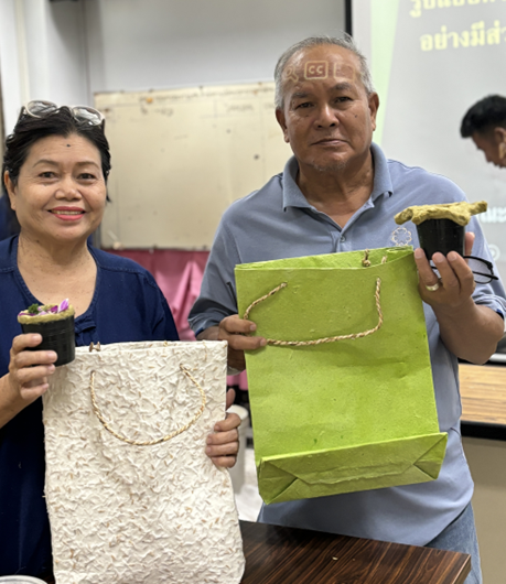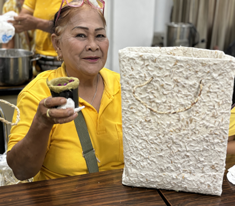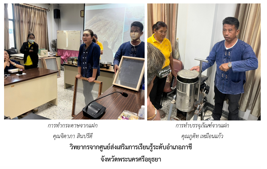 วิทยากรจากศูนย์ส่งเสริมการเรียนรู้ระดับอำเภอภาชี จังหวัดพระนครศรีอยุธยา สาธิตวิธีทำ “กระถางจากหญ้าแฝกแห้ง ฟางแห้ง หรือผักตบชวา” โดยมีวิธีการทำและวัสดุอุปกรณ์ดังนี้