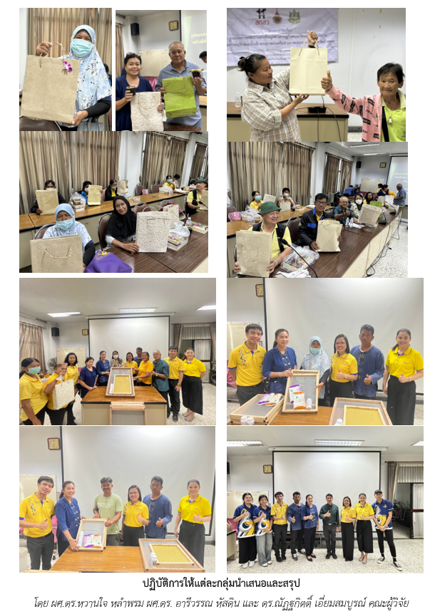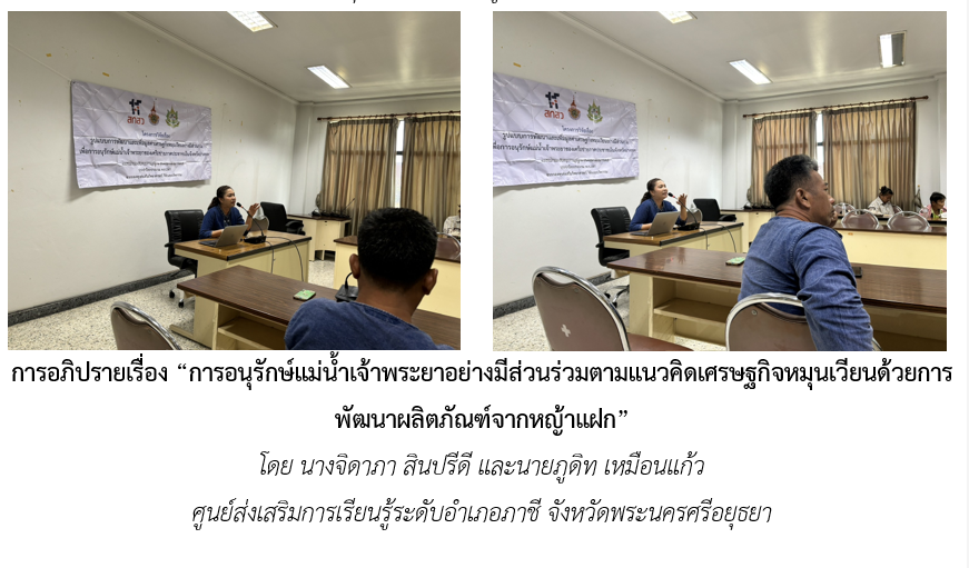 กิจกรรม “การประดิษฐ์ผลิตภัณฑ์จากหญ้าแฝกเพื่อส่งเสริมการอนุรักษ์แม่น้ำเจ้าพระยาบนฐานแนวคิดเศรษฐกิจหมุนเวียน” โครงการวิจัยได้รับความอนุเคราะห์จากศูนย์ส่งเสริมการเรียนรู้ระดับอำเภอภาชี จังหวัดพระนครศรีอยุธยา ซึ่งเป็นศูนย์ส่งเสริมการเรียนรู้ที่มีองค์ความรู้หลากหลายและตั้งอยู่ในจังหวัดใกล้เคียงให้ความอนุเคราะห์วิทยากร วัสดุอุปกรณ์ และองค์ความรู้เพื่อมาถ่ายทอดความรู้และฝึกปฏิบัติ ดังนี้